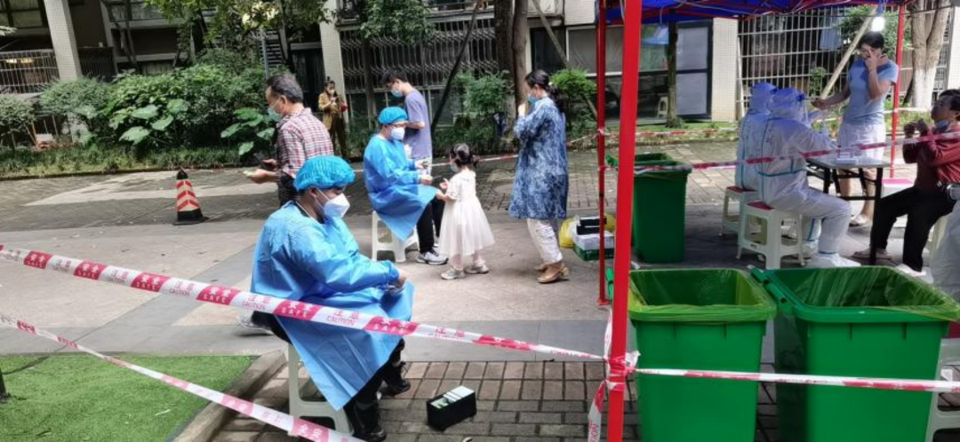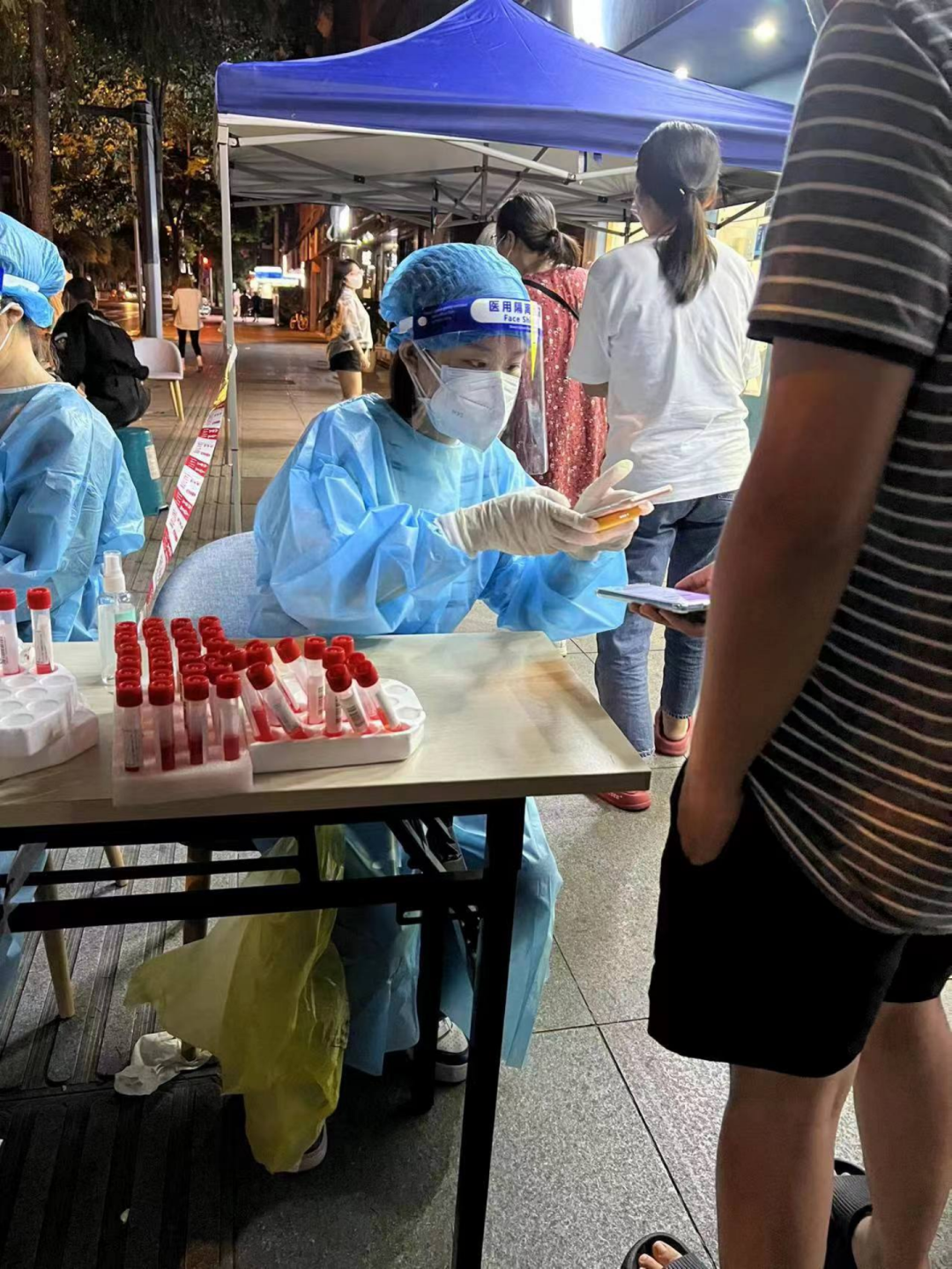 工程局公司楊倩為彭州市天彭鎮(zhèn)龍安社區(qū)居民采集核酸。