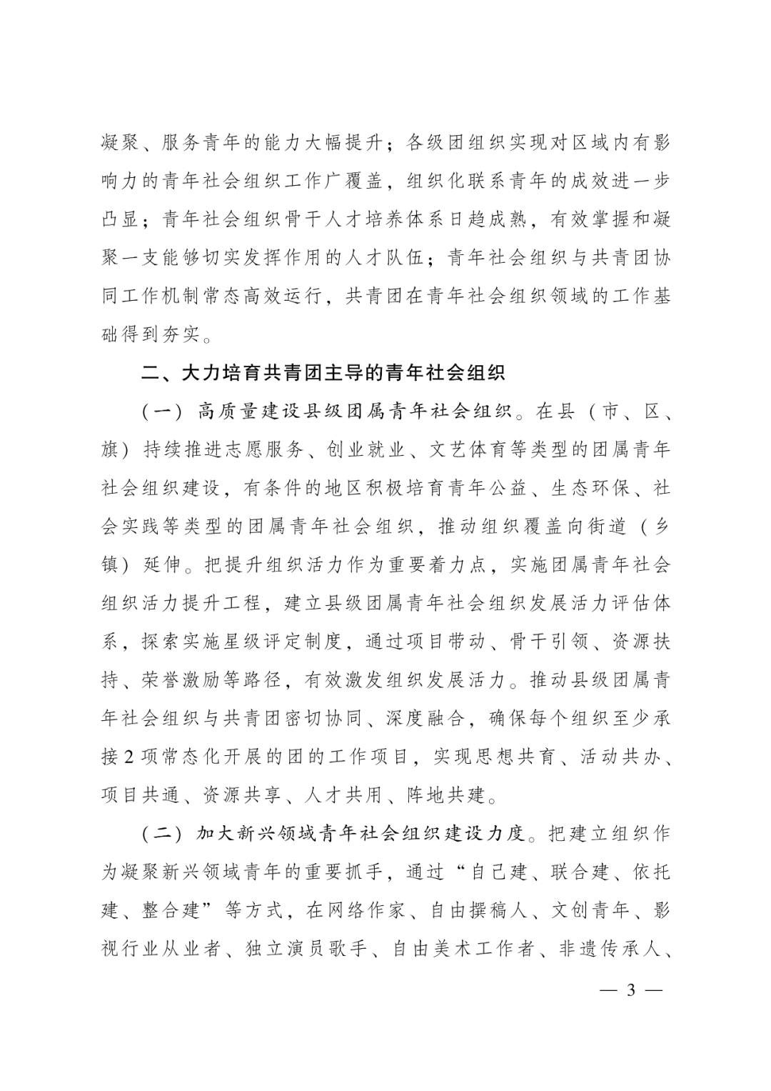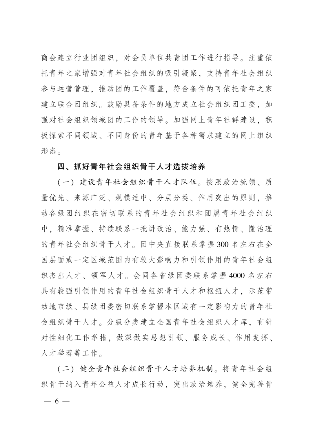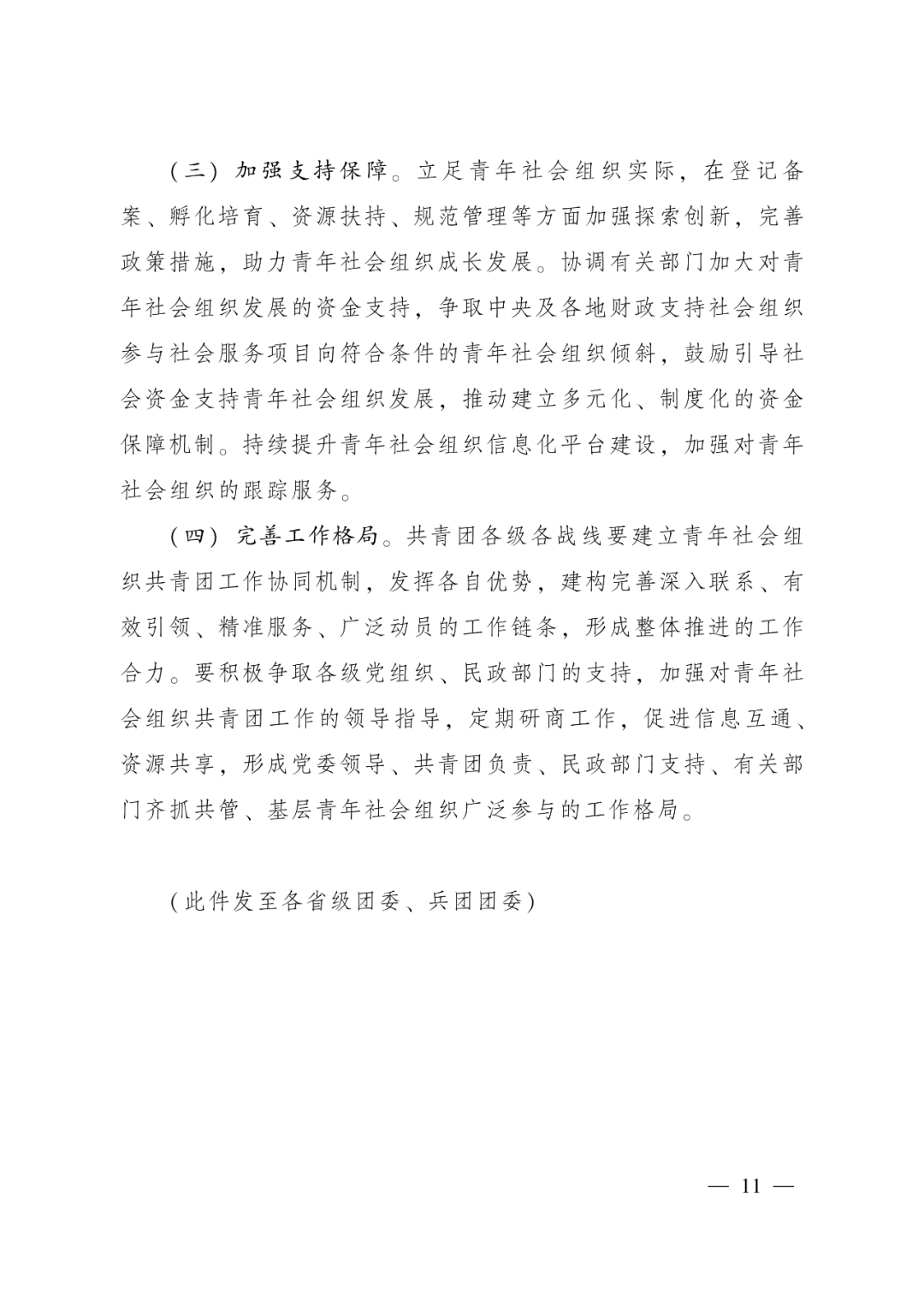 《意見》指出,青年社會組織主要包括以青年為主體和以青少年為主要服務(wù)對象的社會團體、基金會、社會服務(wù)機構(gòu),以及由青年發(fā)起成立、活躍在城鄉(xiāng)社區(qū)但未正式注冊的青年社團、小組、社群等。黨的十八大以來,青年社會組織蓬勃發(fā)展,已成為黨推進國家治理體系和治理能力現(xiàn)代化的重要內(nèi)容、黨的青年工作的重要陣地和團的基層組織的重要形態(tài)。要著眼鞏固和擴大黨執(zhí)政的階級基礎(chǔ)和青年群眾基礎(chǔ),把青年社會組織作為共青團為黨育人、為黨聚人的戰(zhàn)略依托,主動適應新時代新征程新要求,推動青年社會組織共青團工作實現(xiàn)高質(zhì)量發(fā)展。《意見》強調(diào),各級團組織要大力培育共青團主導的青年社會組織,高質(zhì)量建設(shè)縣級團屬青年社會組織,加大新興領(lǐng)域青年社會組織建設(shè)力度,培育發(fā)展形態(tài)多樣的社區(qū)青年社會組織。要擴大共青團在青年社會組織中的有效覆蓋,廣泛聯(lián)系有影響力的青年社會組織,有序推動青年社會組織團建工作,采取靈活方式擴大覆蓋效果。要抓好青年社會組織骨干人才選拔培養(yǎng),建設(shè)青年社會組織骨干人才隊伍,健全青年社會組織骨干人才培養(yǎng)機制,強化政治吸納和成長激勵。要促進青年社會組織與共青團工作緊密協(xié)同,持續(xù)推進基層共青團組織方式和活動方式改革創(chuàng)新,為履行團的根本職責、服務(wù)國家治理體系和治理能力現(xiàn)代化發(fā)揮作用、建功立業(yè)。《意見》要求,各級團組織要加強對青年社會組織共青團工作的組織領(lǐng)導,將其納入共青團深化改革總體布局,作為團的工作述職、評議、督查、考核的重要內(nèi)容。要注重分類指導,尊重青年社會組織發(fā)展規(guī)律,尊重青年主體地位,尊重基層首創(chuàng)精神,鼓勵和指導基層積極探索工作有效路徑。要加強支持保障,完善政策措施,助力青年社會組織成長發(fā)展。要建立青年社會組織共青團工作協(xié)同機制,形成黨委領(lǐng)導、共青團負責、民政部門支持、有關(guān)部門齊抓共管、基層青年社會組織廣泛參與的工作格局。![]()