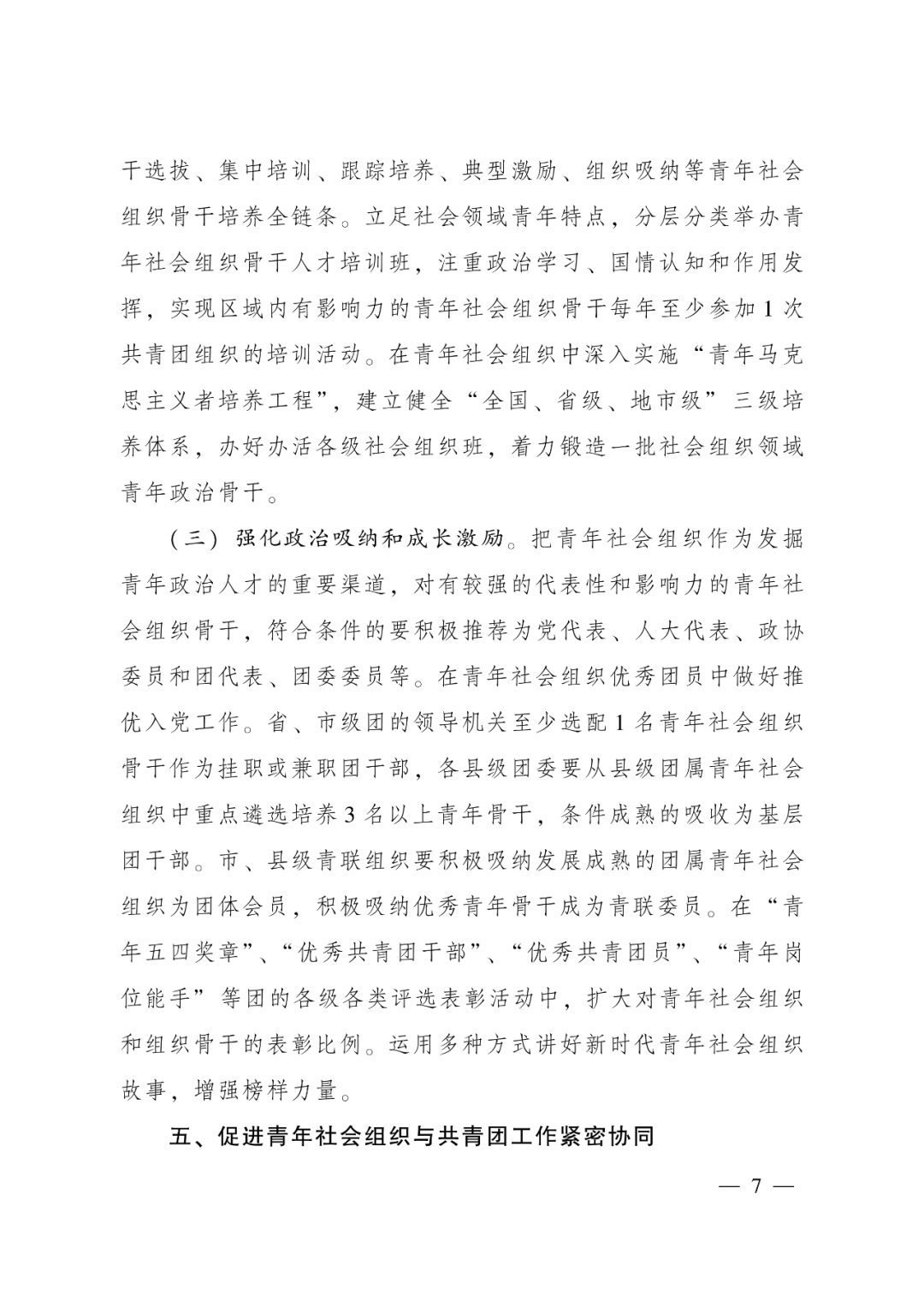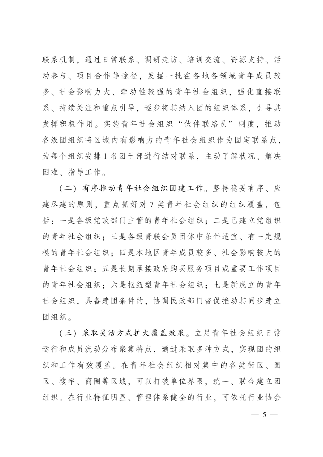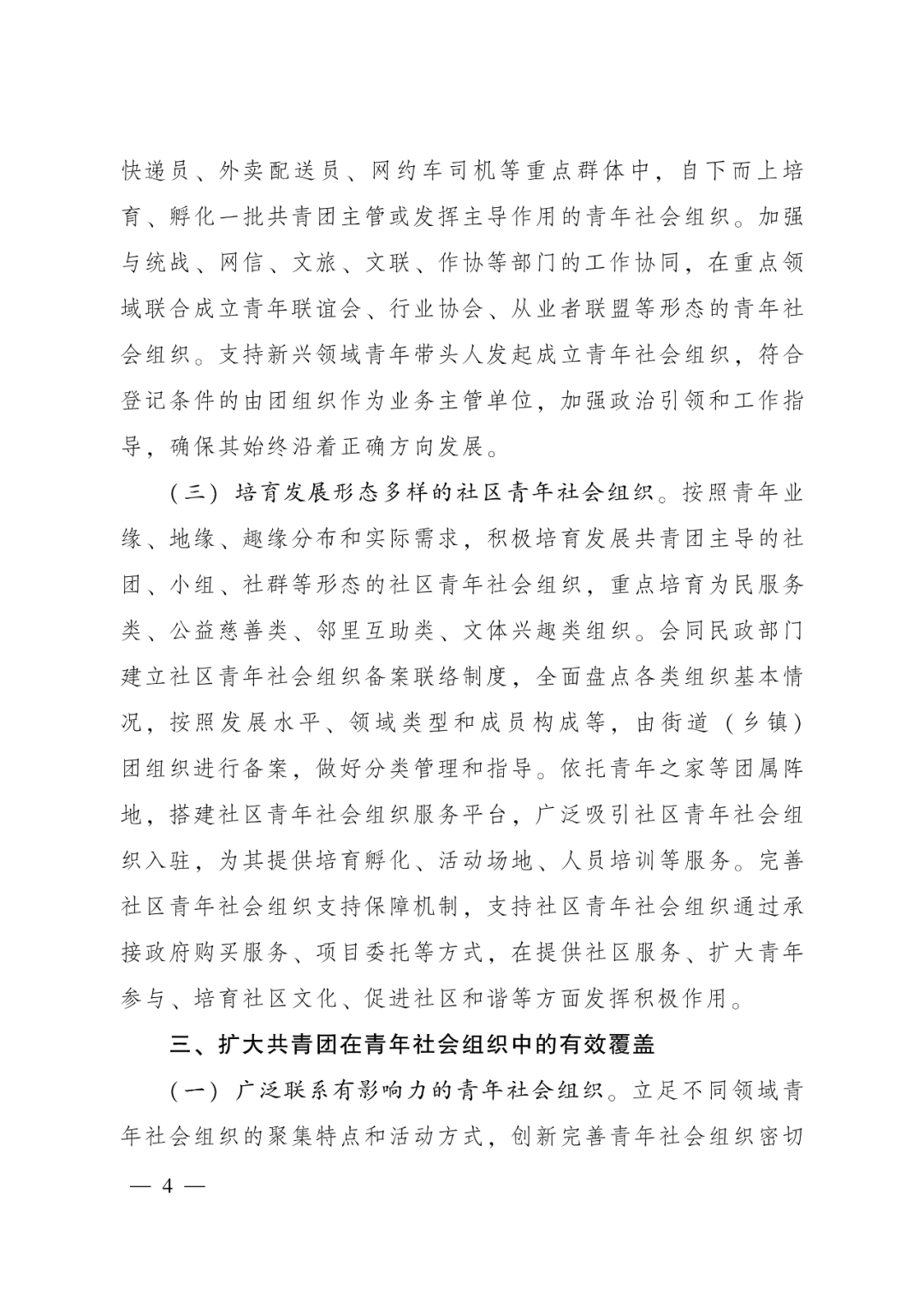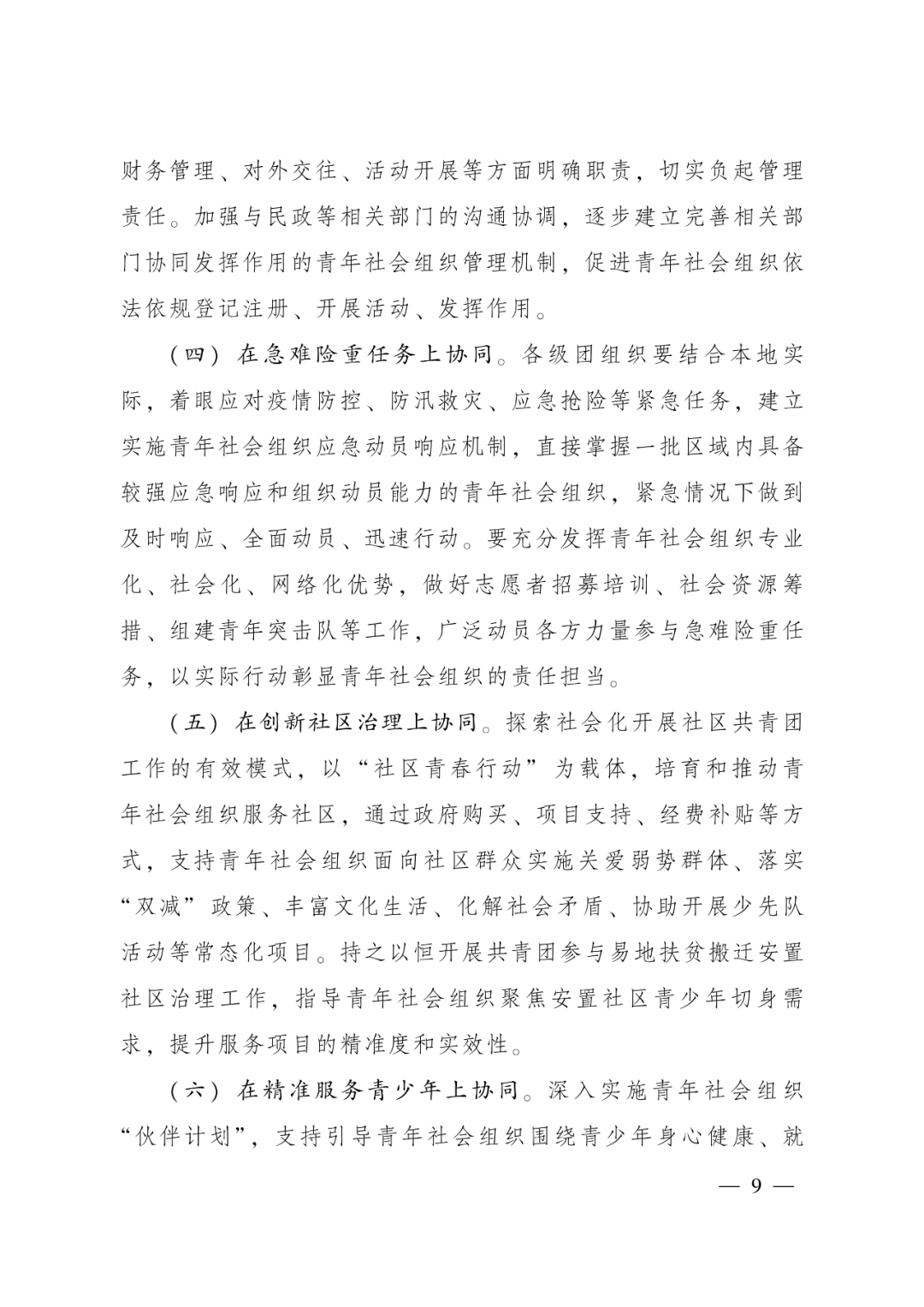 《意見》指出,青年社會組織主要包括以青年為主體和以青少年為主要服務(wù)對象的社會團體、基金會、社會服務(wù)機構(gòu),以及由青年發(fā)起成立、活躍在城鄉(xiāng)社區(qū)但未正式注冊的青年社團、小組、社群等。黨的十八大以來,青年社會組織蓬勃發(fā)展,已成為黨推進國家治理體系和治理能力現(xiàn)代化的重要內(nèi)容、黨的青年工作的重要陣地和團的基層組織的重要形態(tài)。要著眼鞏固和擴大黨執(zhí)政的階級基礎(chǔ)和青年群眾基礎(chǔ),把青年社會組織作為共青團為黨育人、為黨聚人的戰(zhàn)略依托,主動適應新時代新征程新要求,推動青年社會組織共青團工作實現(xiàn)高質(zhì)量發(fā)展。《意見》強調(diào),各級團組織要大力培育共青團主導的青年社會組織,高質(zhì)量建設(shè)縣級團屬青年社會組織,加大新興領(lǐng)域青年社會組織建設(shè)力度,培育發(fā)展形態(tài)多樣的社區(qū)青年社會組織。要擴大共青團在青年社會組織中的有效覆蓋,廣泛聯(lián)系有影響力的青年社會組織,有序推動青年社會組織團建工作,采取靈活方式擴大覆蓋效果。要抓好青年社會組織骨干人才選拔培養(yǎng),建設(shè)青年社會組織骨干人才隊伍,健全青年社會組織骨干人才培養(yǎng)機制,強化政治吸納和成長激勵。要促進青年社會組織與共青團工作緊密協(xié)同,持續(xù)推進基層共青團組織方式和活動方式改革創(chuàng)新,為履行團的根本職責、服務(wù)國家治理體系和治理能力現(xiàn)代化發(fā)揮作用、建功立業(yè)。《意見》要求,各級團組織要加強對青年社會組織共青團工作的組織領(lǐng)導,將其納入共青團深化改革總體布局,作為團的工作述職、評議、督查、考核的重要內(nèi)容。要注重分類指導,尊重青年社會組織發(fā)展規(guī)律,尊重青年主體地位,尊重基層首創(chuàng)精神,鼓勵和指導基層積極探索工作有效路徑。要加強支持保障,完善政策措施,助力青年社會組織成長發(fā)展。要建立青年社會組織共青團工作協(xié)同機制,形成黨委領(lǐng)導、共青團負責、民政部門支持、有關(guān)部門齊抓共管、基層青年社會組織廣泛參與的工作格局。![]()